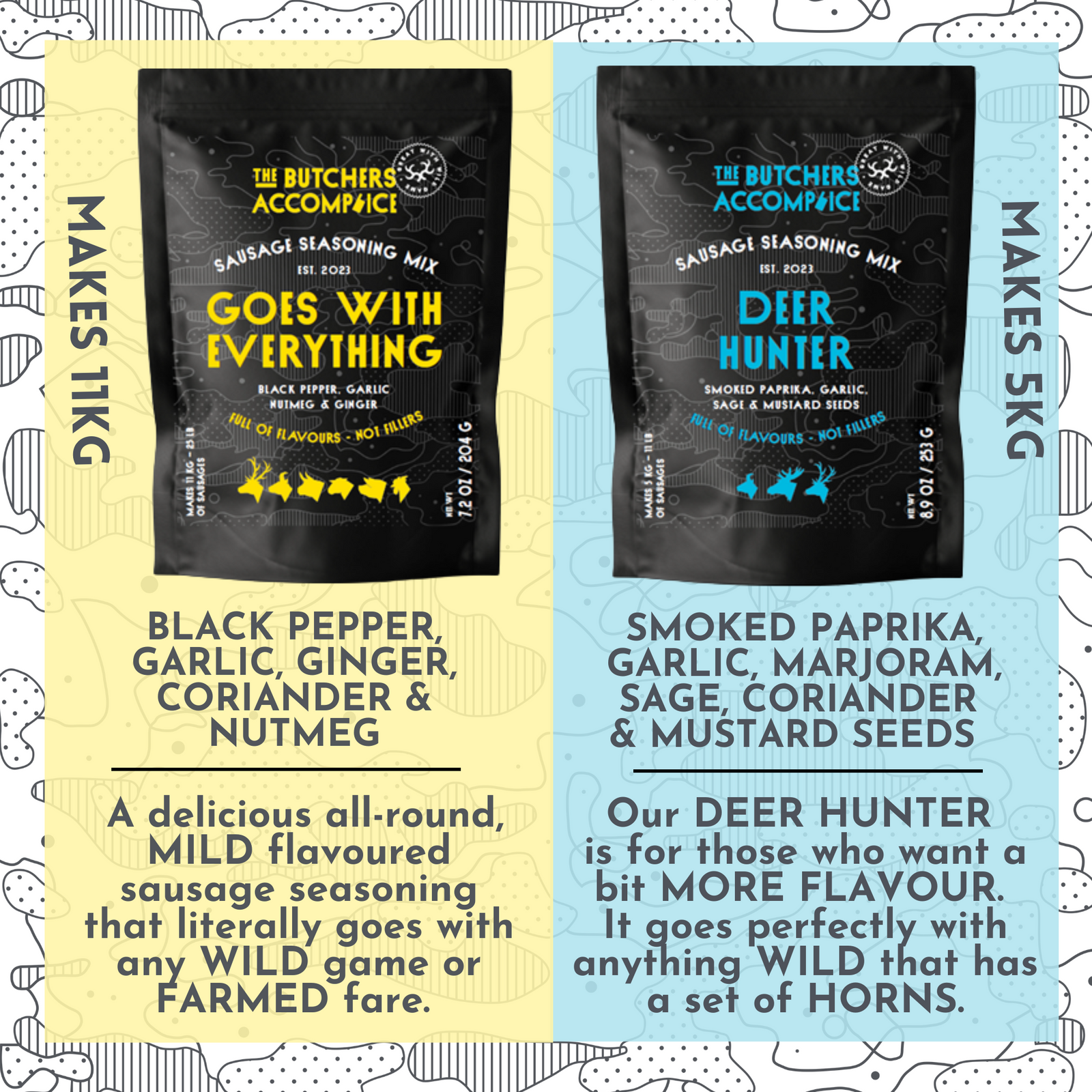 This one is for the hunter gatherers out there who like a bit more of a flavour kick, but wont scare off the kids*. Packed with garlic, paprika, sage, mustard seeds, all spice & coriander, this is a delicious sausages seasoning that goes perfectly with venison or anything else with a set of horns.